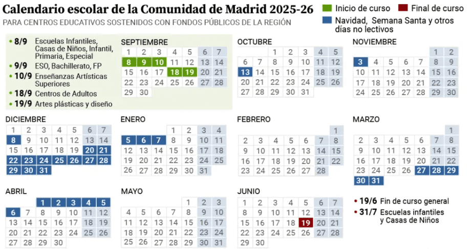 El calendario escolar de Madrid 2025-2026 establece un curso que comienza entre el 8 y el 18 de septiembre, según el nivel, y se extiende hasta el 19 de junio, salvo en Infantil de primer ciclo, que acaba el 31 de julio.