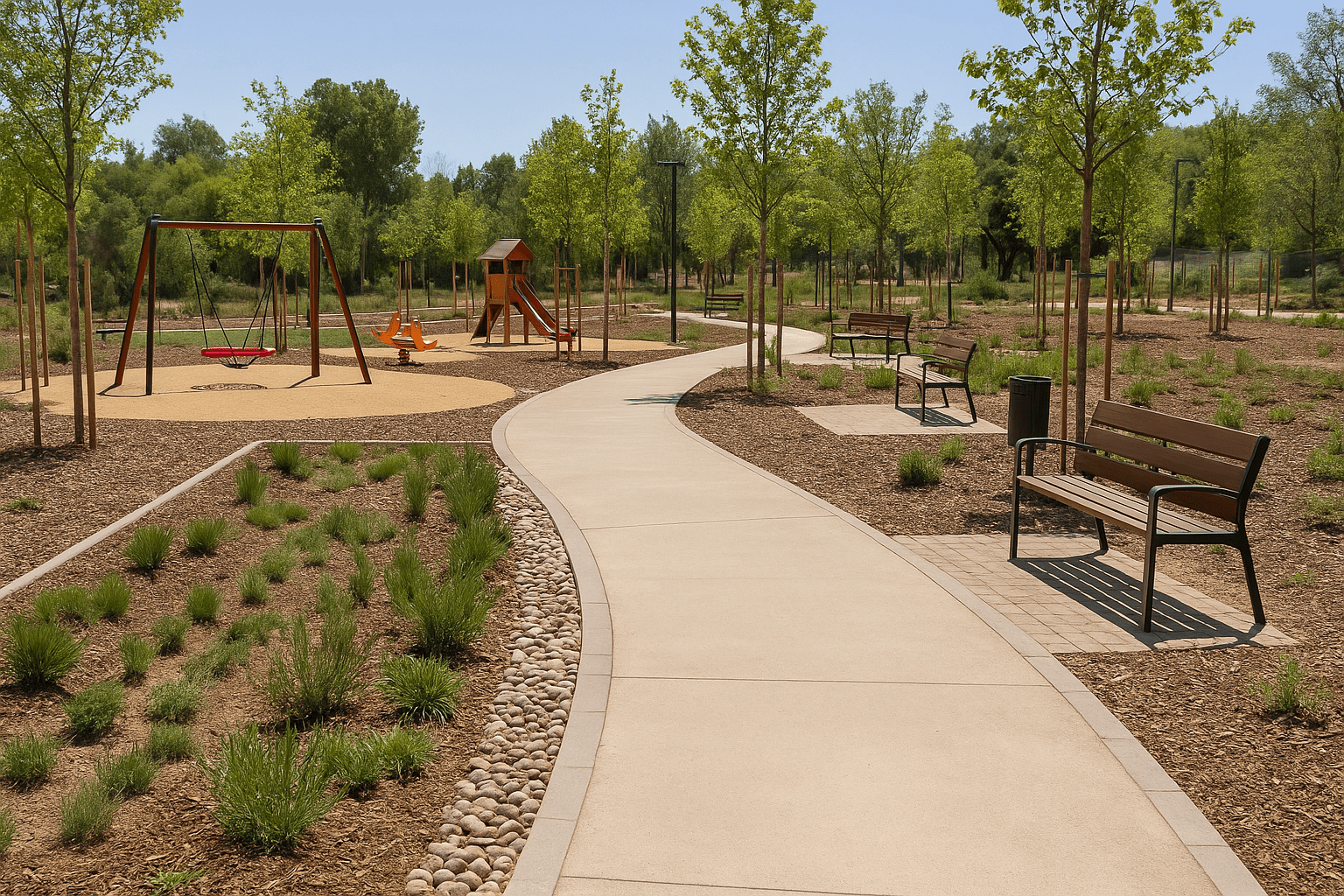 Uno de los elementos más innovadores del parque es la instalación de jardines de lluvia. Estas estructuras vegetadas captan el agua, la filtran y la reutilizan para el riego de los árboles y arbustos. Gracias a este sistema, se garantiza una gestión eficiente del agua incluso en épocas de sequía.
