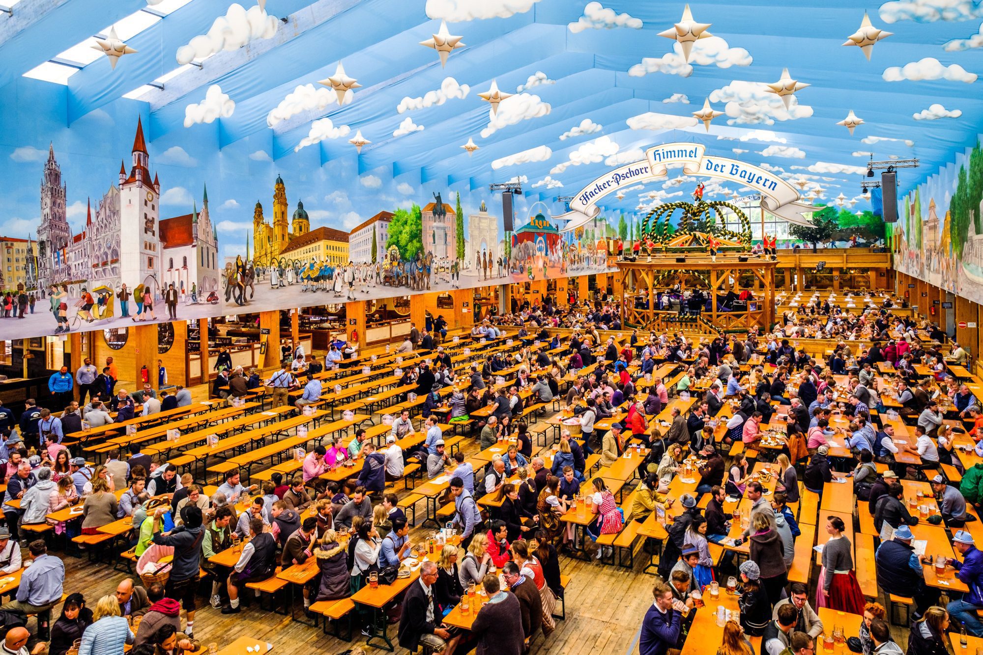 Los camareros vestidos con trajes típicos bávaros, capaces de sostener varias jarras de cerveza de medio litro a la vez, ayudarán a recrear el ambiente festivo de Múnich.